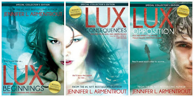 These are the re-vamped covers of the Lux Series. Lux Beginnings encapsulates book 1 and 2 Obsidian and Onyx. Lux Consequences is Book 3 and 4, Opal and Origin, Opposition is book 5.